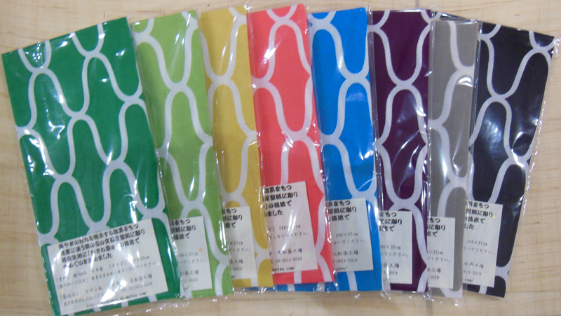 手法で太さの違う網目文様の手ぬぐいを多色染めています。